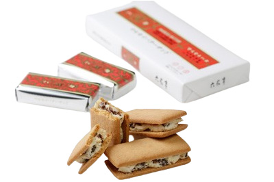特製のホワイトチョコレートと北海道産のバター、そしてレーズンを合わせたクリームをビスケットでサンドしてあります。